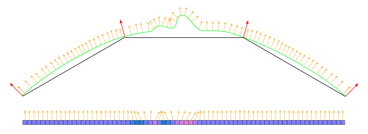 부드러운 셰이딩의 2D 다이어그램을 조금 더 자세히 보면, 노멀 방향을 결정하는 데이터는 실제로 버텍스별로만 저장되므로 전체 표면에 걸쳐 변하는 값은 버텍스 간에 보간된다. 위 다이어그램에서 빨간색 화살표는 각 버텍스에 저장된 노멀 방향을 나타내고, 주황색 화살표는 전체 폴리곤 영역에 걸쳐 보간된 노멀 방향의 예를 나타낸다.