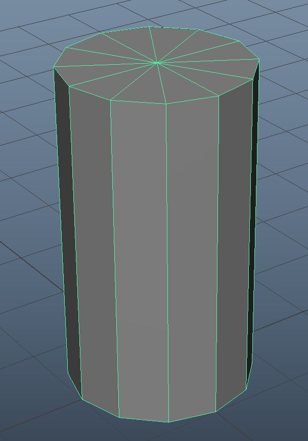 노멀 방향은 평평한 폴리곤 표면 전체에 걸쳐 점진적으로 변하므로 표면 전체에 걸친 셰이딩이 (녹색 선으로 표시된 것처럼) 부드러운 곡선 같다는 인상을 준다. 메시의 실제 폴리곤 성질에는 영향이 없고, 평평한 표면에서 조명이 계산되는 방법에만 영향이 있다. |