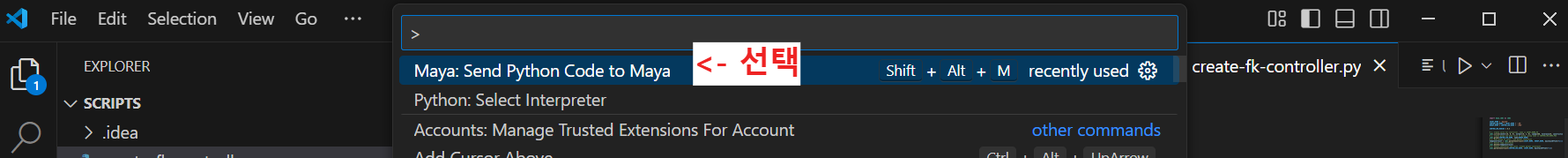 2. 파이썬 스크립트 작성 후, VSCode에서 "Ctrl + Shift + P" 단축키를 누른 후 "Maya: Send Python Code to Maya"를 찾아서 선택