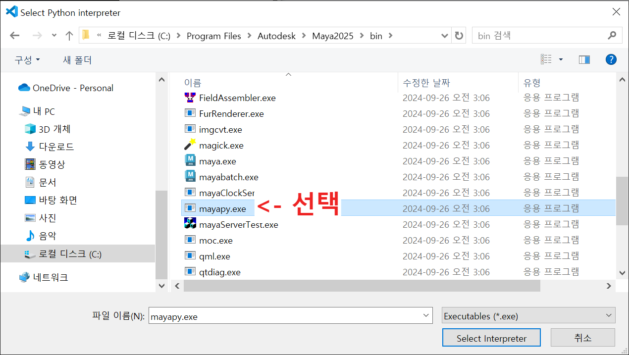 3. "Enter interpreter path..."선택 후 "Find..."를 선택하여 마야가 설치된 폴더에서 "bin\mayapy.exe"를 선택하면 끝